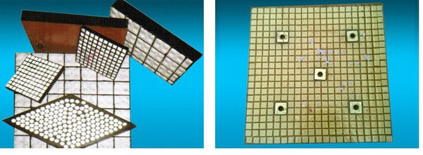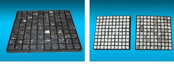 通過橡膠硫化技術,將馬賽克陶瓷鑲嵌在特種橡膠內,構成方形陶瓷橡膠復合體,在依靠焊接(三合一系列)或者高強度粘結劑黏貼(二合一)方式固定在設備的防護面上,形成堅固且有緩沖力的防磨層,較大的拓展了氧化鋁陶瓷的使用范圍。產品廣泛應用于火力發(fā)電廠的輸煤、排灰系統(tǒng)及冶金鋼鐵業(yè)的輸料、配料料倉、料斗等設備,有效的解決了因物料落差大,沖擊力強,導致配料輸送系統(tǒng)使用壽命低的問題;同時,陶瓷橡膠復合襯板能扭曲、劃割,適應于各種異型設備的安裝。