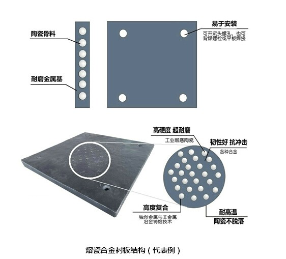 熔瓷耐磨襯板由耐磨陶瓷骨料和高韌金屬基構(gòu)成,巧妙的強化了成分材料的各自優(yōu)點,避開了各自的弱點,解決了陶瓷耐磨不抗沖擊,金屬有韌性而不耐磨的組合難題。